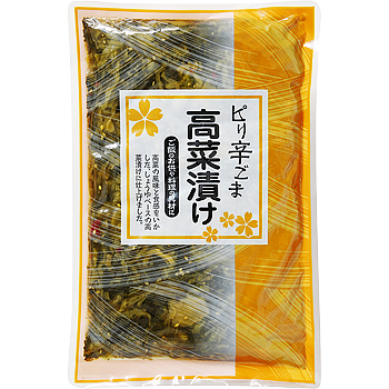 しょうゆベースの高菜漬けにピリ辛のアクセントとごまの香ばしさが加わり、ご飯やお酒のお供にぴったりの味わいです。