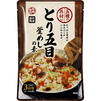 お米と水に加えて炊飯器で炊くだけで、鶏やかつお、昆布の旨みが効いた本格的な五目釜めしが手軽に完成します。