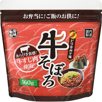牛すじ肉を贅沢に使い、しっかりとしたあらびきの食感が楽しめる牛そぼろです。肉の旨味と食べごたえが感じられます。